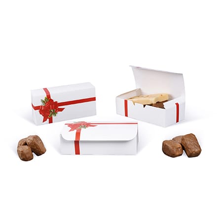 From fudge to truffles, candy and fine chocolates, these one-piece 1 lb candy and fudge boxes are ideal for packaging a variety of confectionary delights. Each one-piece box comes with an automatic bottom that pops up, making it quick and easy to assemble. A seasonal ribbon and holly design on the top of the fudge box brings the spirit of the holidays to your packaging.