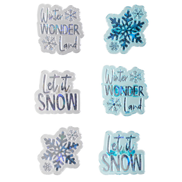 Celebrate the winter holidays with these iridescent rings. Assortment includes snowflakes and statements of Let It Snow and Winter Wonderland. Great for cupcakes, donuts, or even finish off the look of a cake. Made with food-safe plastic.